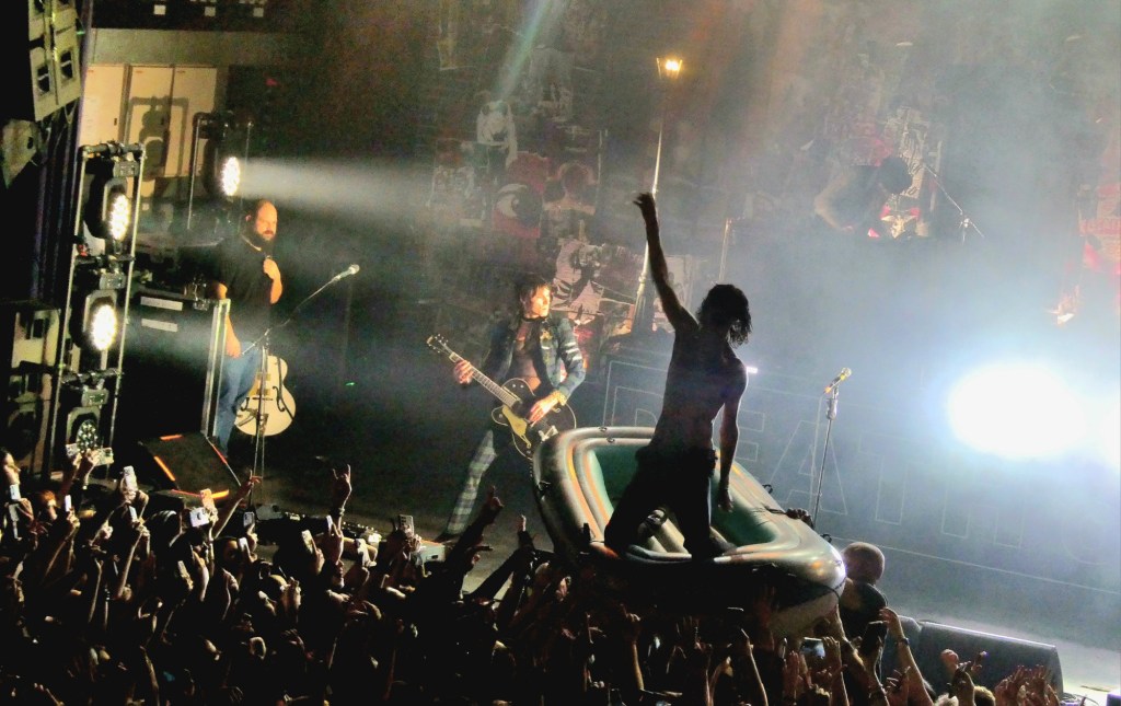 But the real show stopper: an inflatable raft appears out of the front pit and onto the crowd heads at the front – then Leith leaps aboard before riding the sea of fans.