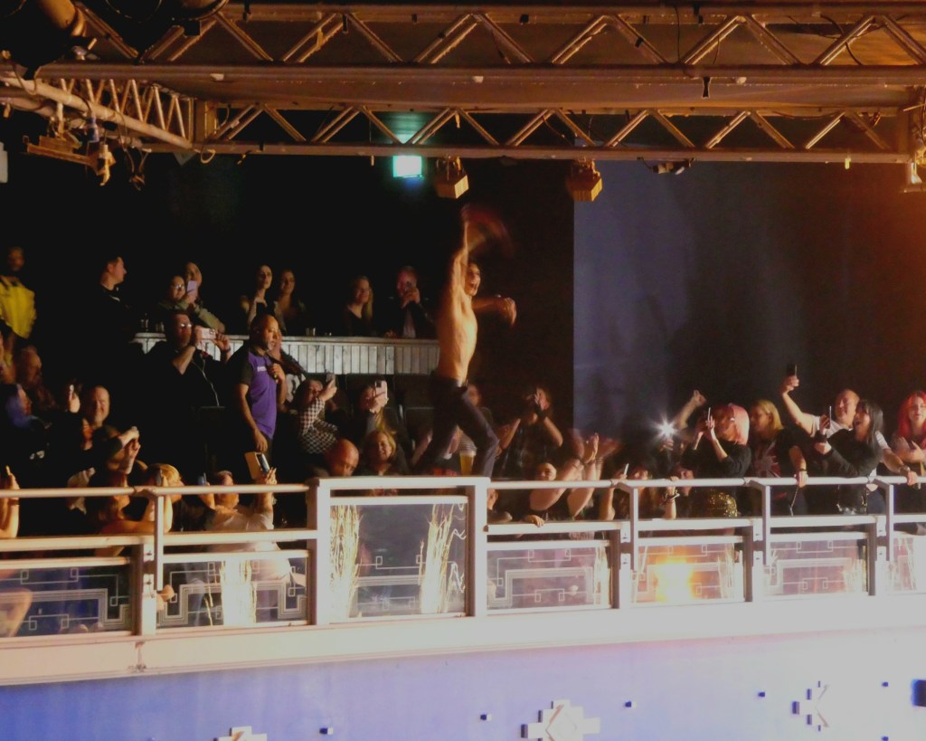 Leith’s activity is staggering. He leaps down from the drum and keyboard plinth, stands up on top of the crowd, jumps down in the crowd, parting it to start the mosh. Later he disappears down a side and appears up dancing on the left balcony – the stewards must be having kittens, having been shining torches on anyone standing near the balcony edge. Not sure if something has happened here – there is an extra rail that looks to have been a later attachment.