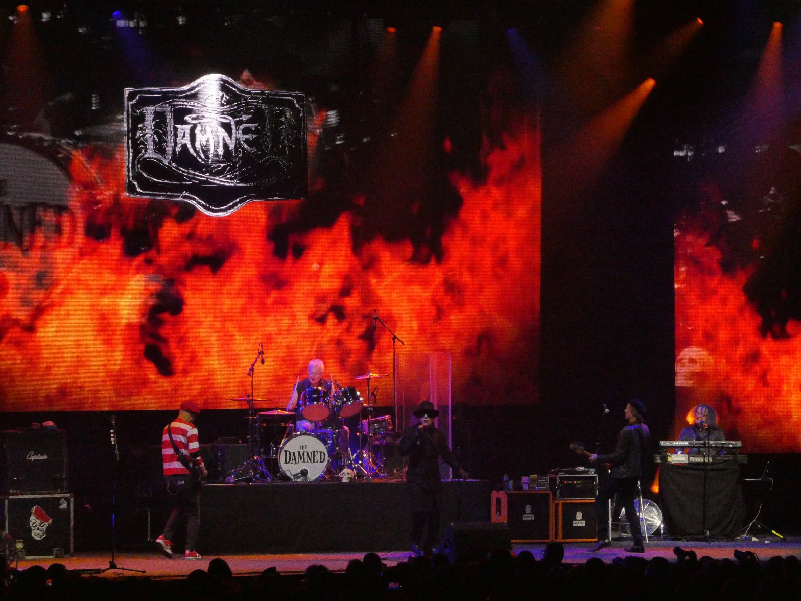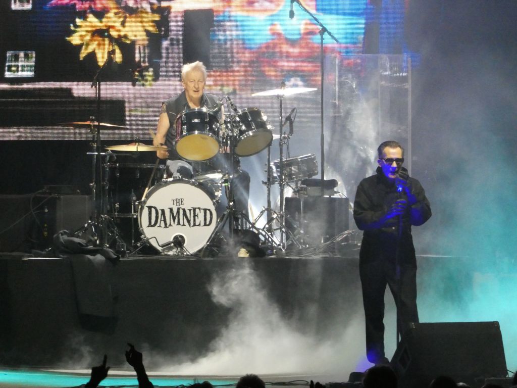 The Damned come on with the stage much cleared, at 9pm. The backdrop is fitting for the occasion. Historic images interspersed with varied imagery, starting with a wall of fire for the opener, Streets of Dreams (1985), moving to the eerie goth style and that beautiful black and green so familiar in Damned tour lighting. A start so good that I wonder if they might peak too early – three tracks in a row from my favourite Black Album: Wait for the Blackout; History of the World and Dr Jekyll and Mr Hyde, the latter with Dave Vanian prowling, dressed in full black with hat dipped and soon removed, twisting slowly across the stage as he sings.