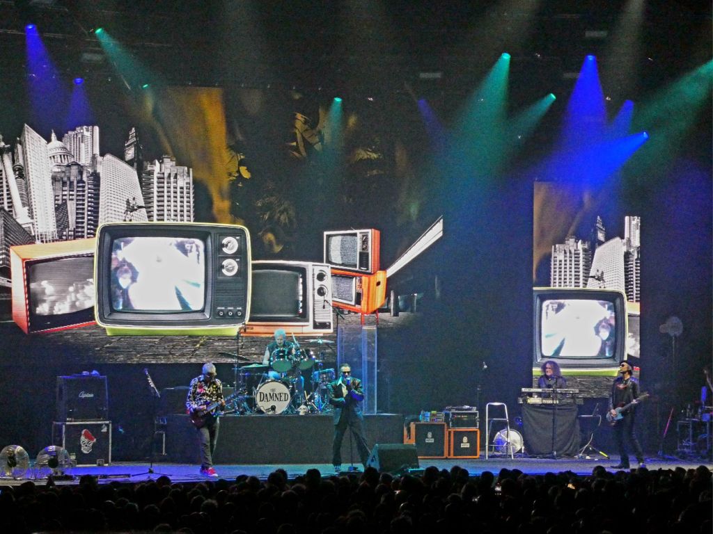 First half done and a breather for band and audience, especially the ageing moshers. Pearl and Dean music and imagery, that we all remembered, announced the selection of nostalgic TV adverts from back when the Damned started in the mid-seventies. I wonder where the stars of the Flake and the Shake and Vac ads are these days?