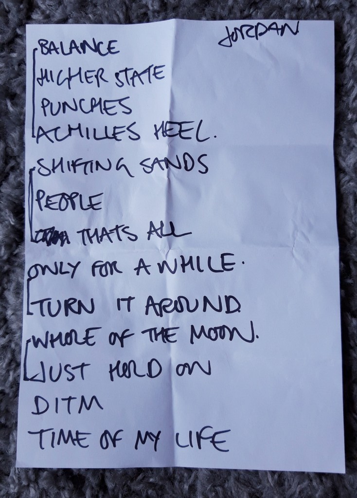 Quite a diverse set given the focus on the first album on the tour promo material, including The Waterboys’ ‘Whole of the Moon’ and rounding off with the first track from Magic Hotel: ‘Time of my Life’. At least four I note being from the first album, which will really stick with me now.