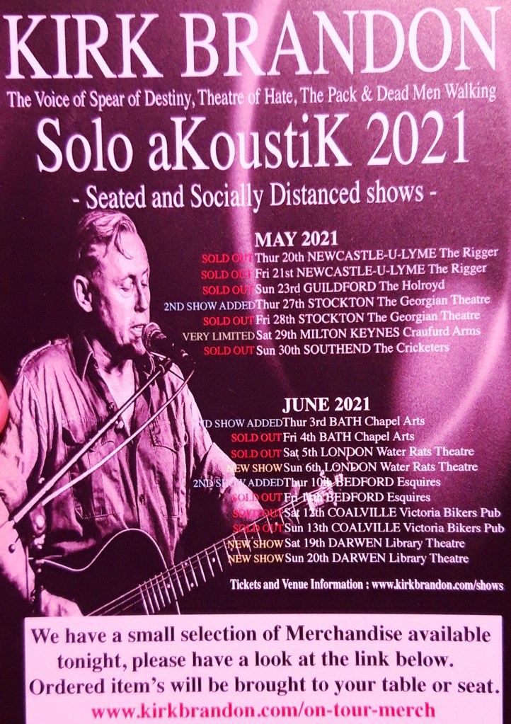 I’ve seen Kirk’s Theatre of Hate and Spear of Destiny many times, way back when (ToH at Hammersmith Palais takes some beating) and in recent years, covered in My Kirk Brandon Years blog, this was only my second solo Kirk gig – well there was a cello accompaniment at the first at Winchester Railway about 10 years ago.