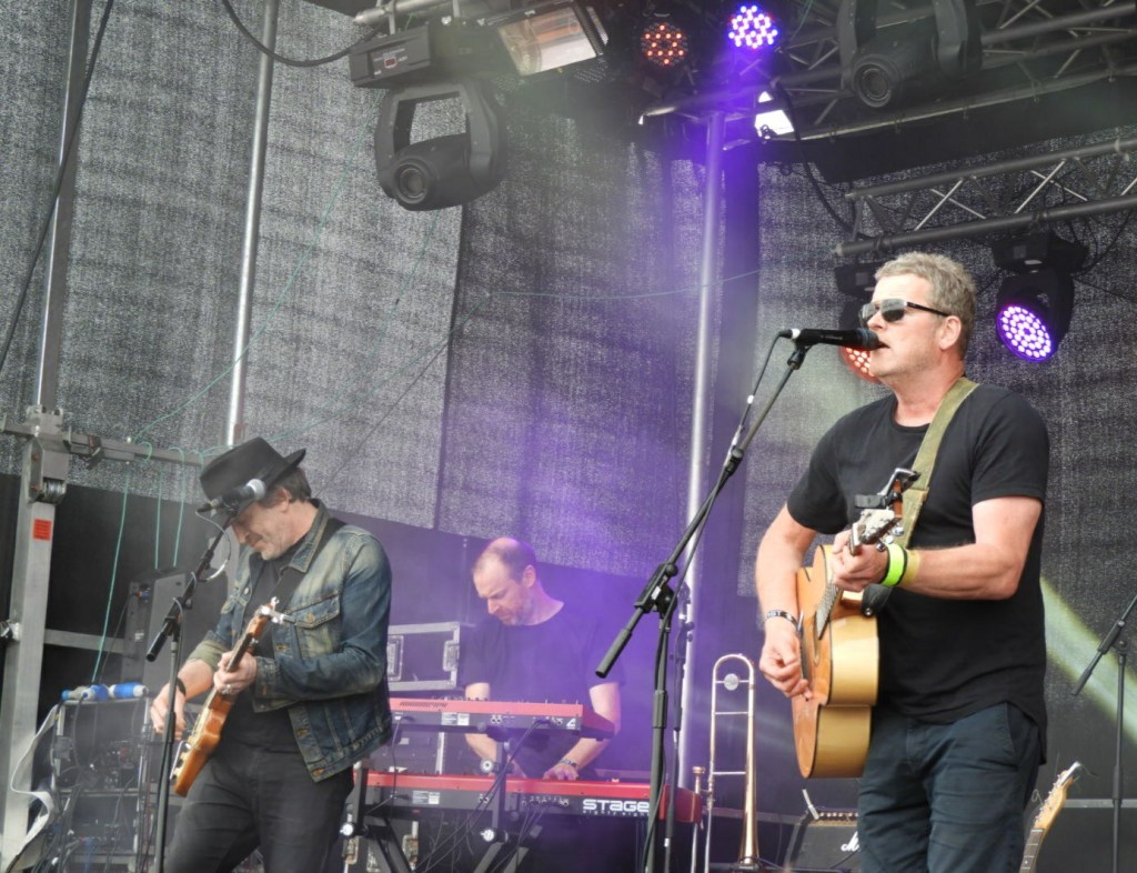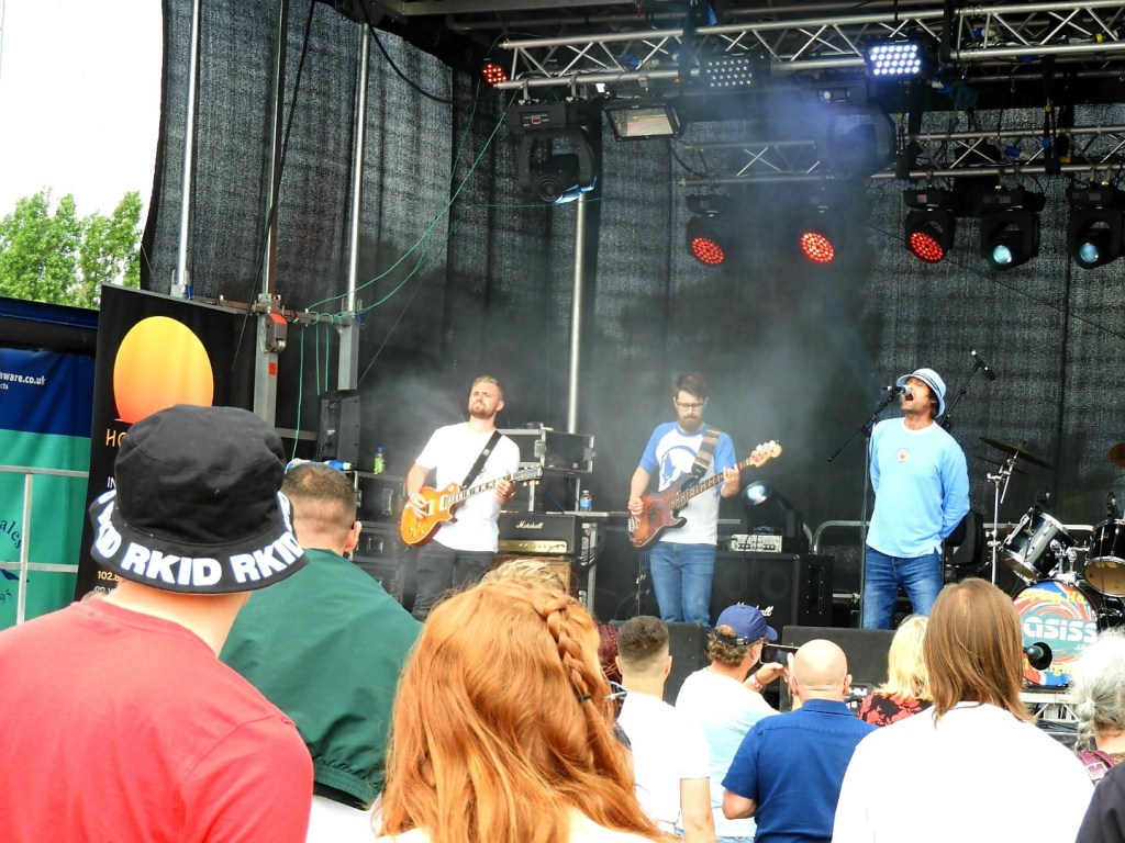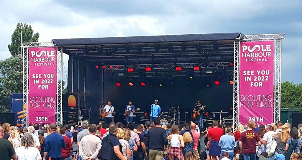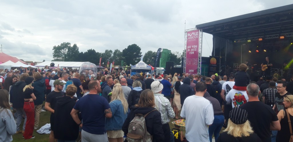 The Poole Harbour Festival has run for several years and this looked better than ever in terms of set up, attendance – a couple of thousand maybe – bars, food stalls and children’s attractions – I still don’t know what ‘Rent a Dinosaur’ is but it sounded innovative. For starters the no wait cans bar has sorted a lot of prevous years’ queueing out. Main stage was much bigger than most previous years and not in a tent… which looking at the sky later I thought we might regret.. we didn’t…as predicted our soaking happened but was short lived.