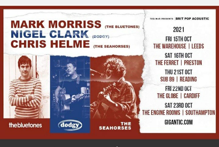 This was intriguing. Three lead singers from different bands play solo acoustic sets and join up for a final set: Nigel Clark of Dodgy, Mark Morriss of The Bluetones and Chris Helme of The Seahorses.