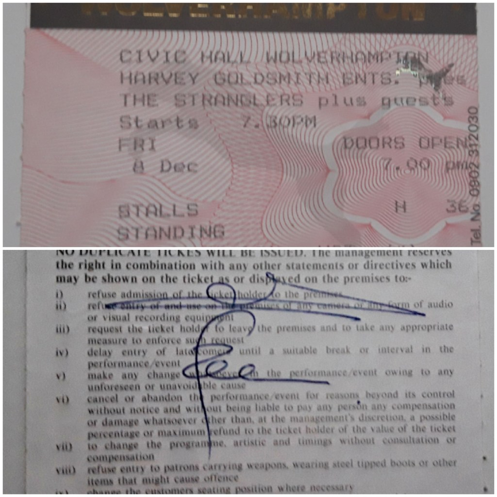 One that always sticks in the mind was the trip to Wolverhampton in the early 90s, from my then Coventry home, and when standing outside trying to sell a spare ticket, Stuart Pearce (England full back and massive Stranglers fan) rocked up while we (mate Chrisinblack, CMe, was there) were spotting lookalikes to kill time. ‘This bloke looks a bit like Stuart Pearce’ I muttered – “it IS Stuart Pearce!” I got him to sign the spare ticket and kept it. It was top gig – beer fuelled – I remember Walk on By particularly and Dave Greenfield doing his downing a pint while playing his solo thing. That was in the Paul Roberts frontman era.