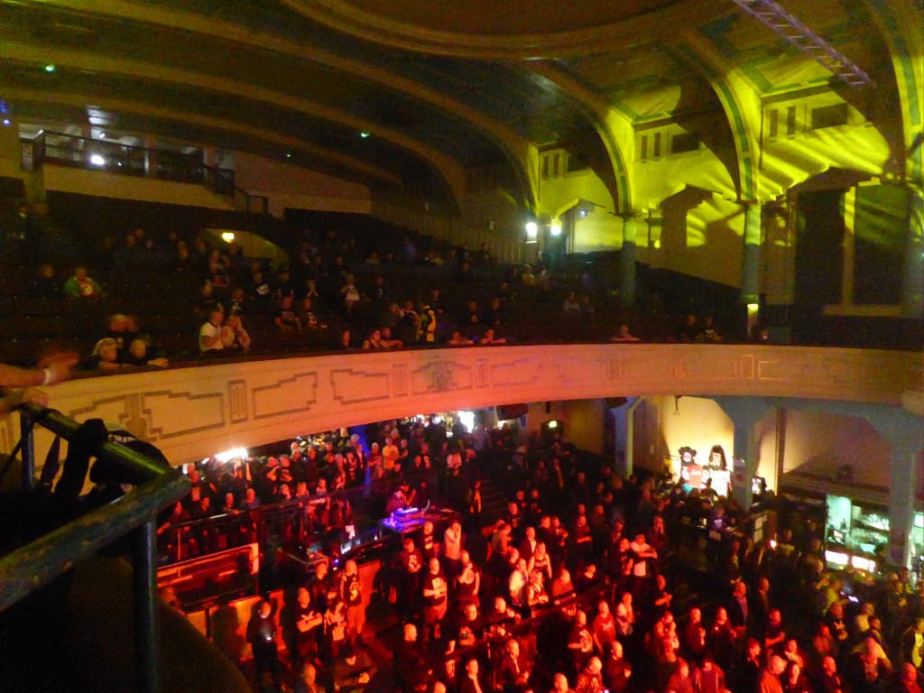 We had pitched up at the front of the balcony to start with in unreserved seating. Standing room downstairs with various tiers and stairways giving a good variety of vantage points – I had a wander around and checked out the numerous merch stands, smaller bands upstairs. The upstairs area has some seating and tv screens show the stage. There’s a bar up there as well as the ones on the ground floor. (Actually there are some special offers so you can get a pint for £3.50.)