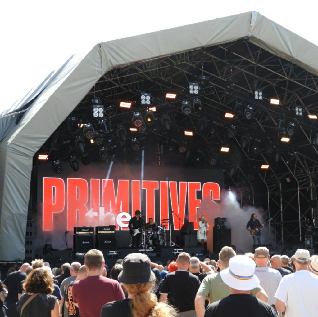 I got the tram up to North Pier (nice little spot for a mooch about – a quiet coffee – Sooty started his first gigs here) and dropped down through the irritating zig zag queue barriers to the outdoor, seafront R-Fest stage for the bag search and pat down just in time for The Primitives – a 2.30pm kick-off. I plonked myself down on the floor near front, to the left, against a barrier. The crowd was spaced enough that I could see pretty well so I just got up for a few songs and to take some pics.
