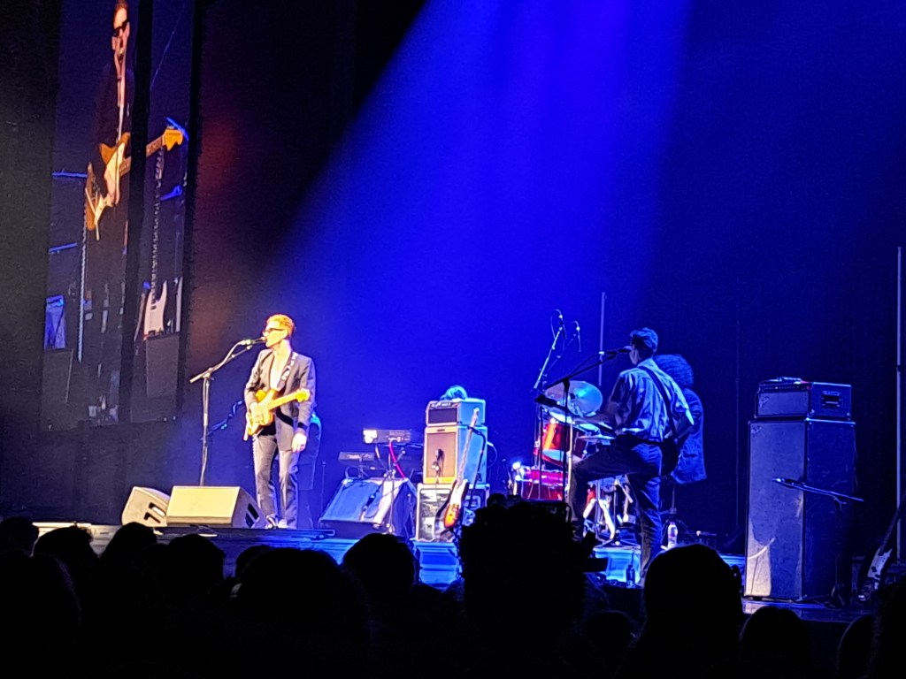 The crowd are absorbed in the glowing Flo performance. It is reminiscent of Kate Bush, not that I saw her live. At the height of the set she disappears from view. What’s happening? Then she appears, floodlit at the back of the hall, near the mix desk singing up at the balcony front row. Then a flurry of activity as some of the crowd security team come quickly through, towards us with torches and followed by the floodlit Florence. She pauses for split seconds as she skips through gracefully touching and greeting fans including the girl directly in front of us. I could have fainted for her. Her (school) friends are suitably impressed with this baptism as Flo floats back to the stage to huge cheers.