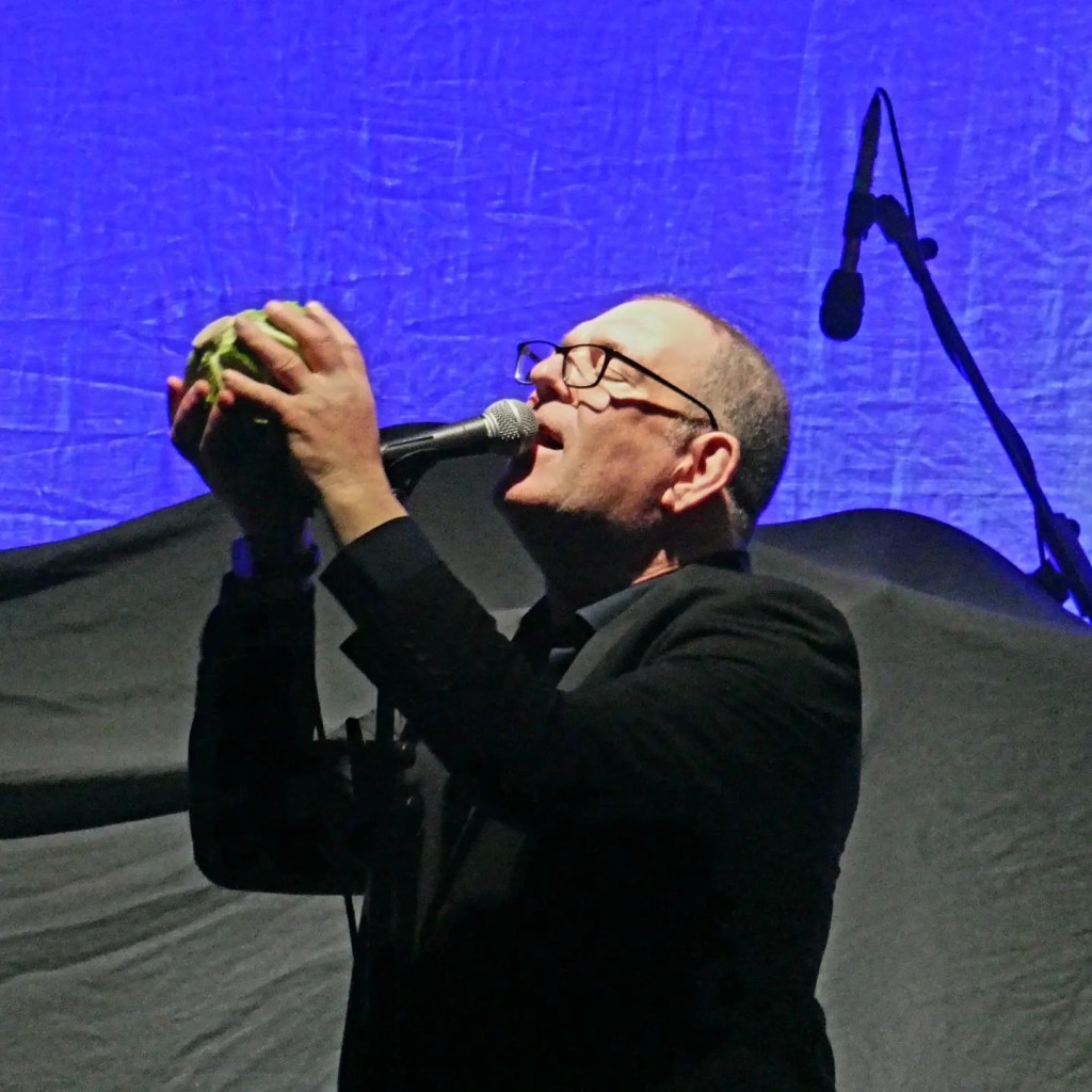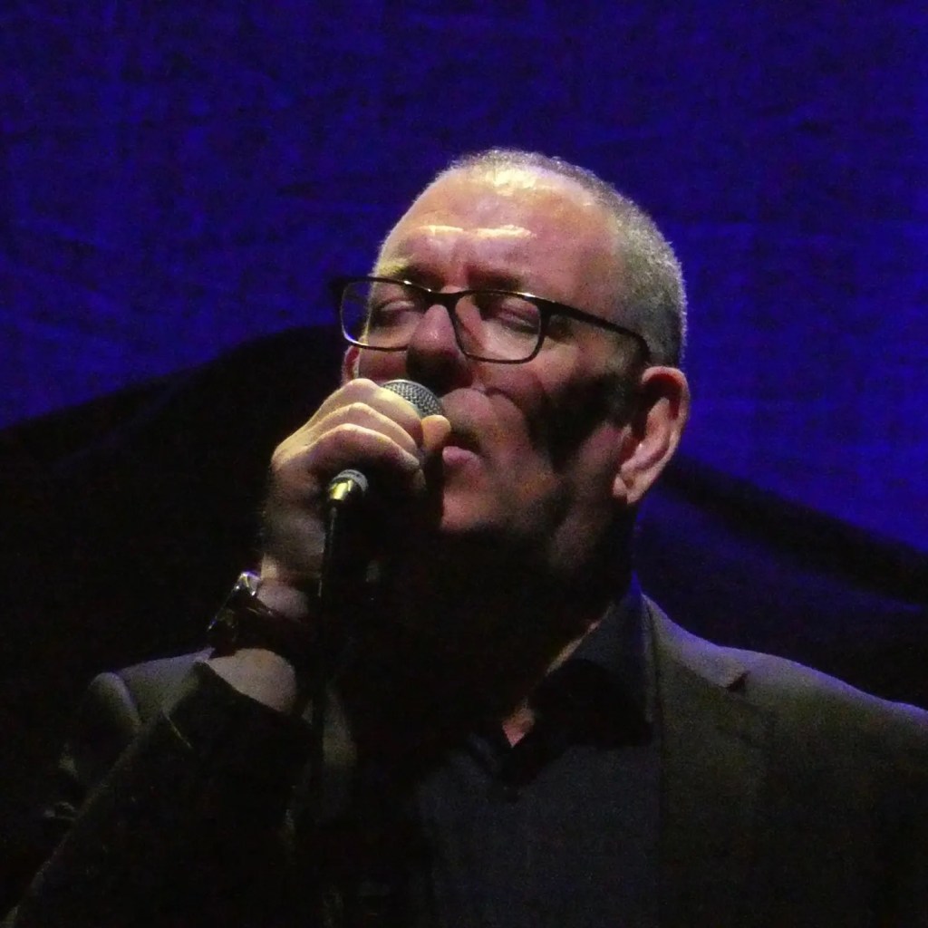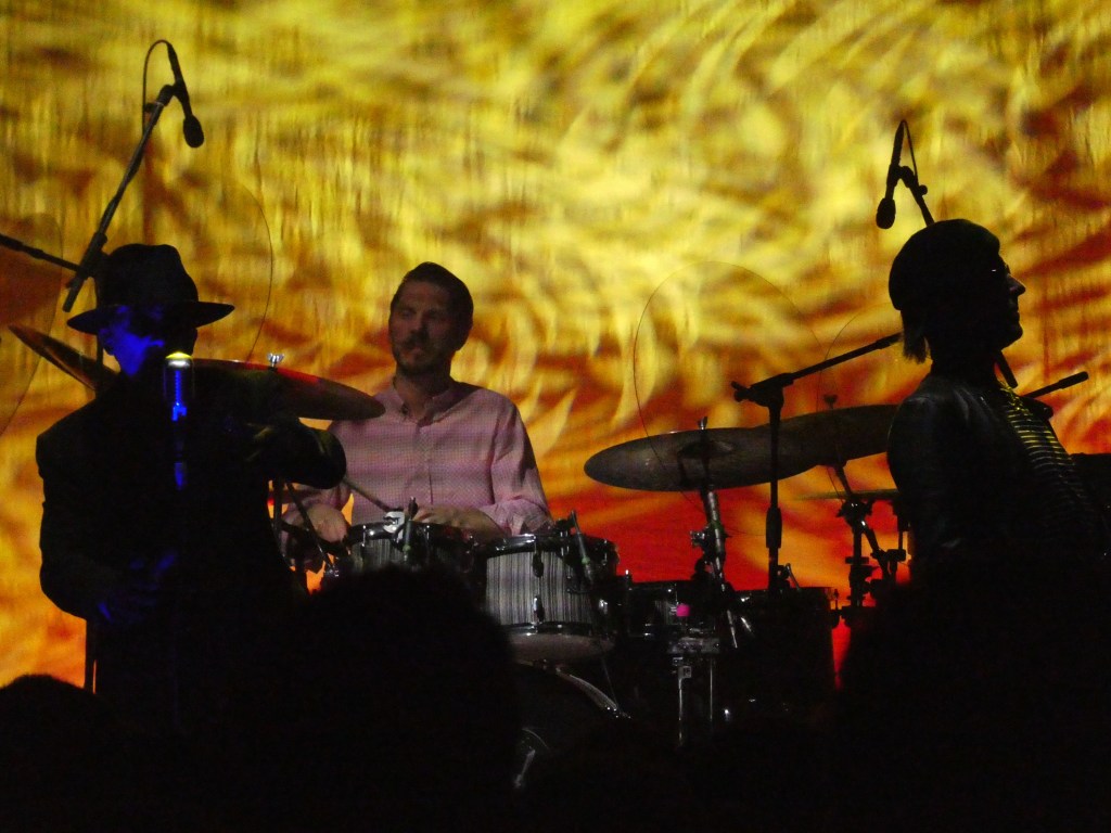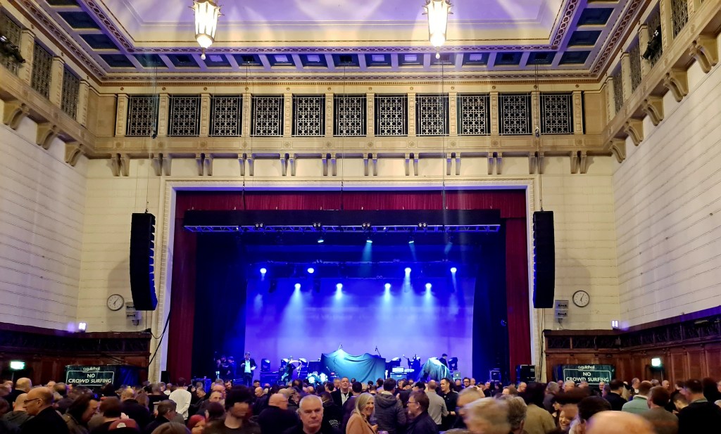 We pop over – I say pop over but my knee is heavily strapped – to the Guildhall. I lead us to the barrier at the side of the mixing desk – essential leaning place required for my knackered leg. (Notes on the venue in my Guildhall blog.) Also there is the hope that the sound near the mix desk might hold up – this high box of a room continues to be a challenge for sound engineers and unfortunately tonight they’re going to be losers again.