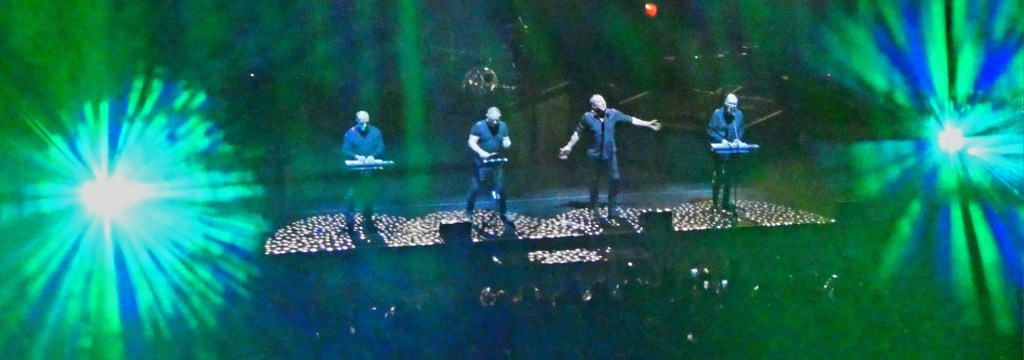 The First Direct Arena opened in 2013 and the stated capacity is just under 14,000. Tonight, it has areas of the steep curved bank of seats blanked out with black covering, with a large standing area in front of the stage. It’s more D-shaped so you get a decent view from anywhere: not bad for an arena. Maybe it expands its floorspace for some events but this D-shape works better than the long arenas that leave too many gig-goers way back from the stage. This is a pretty big crowd for OMD to pull in despite not selling out.