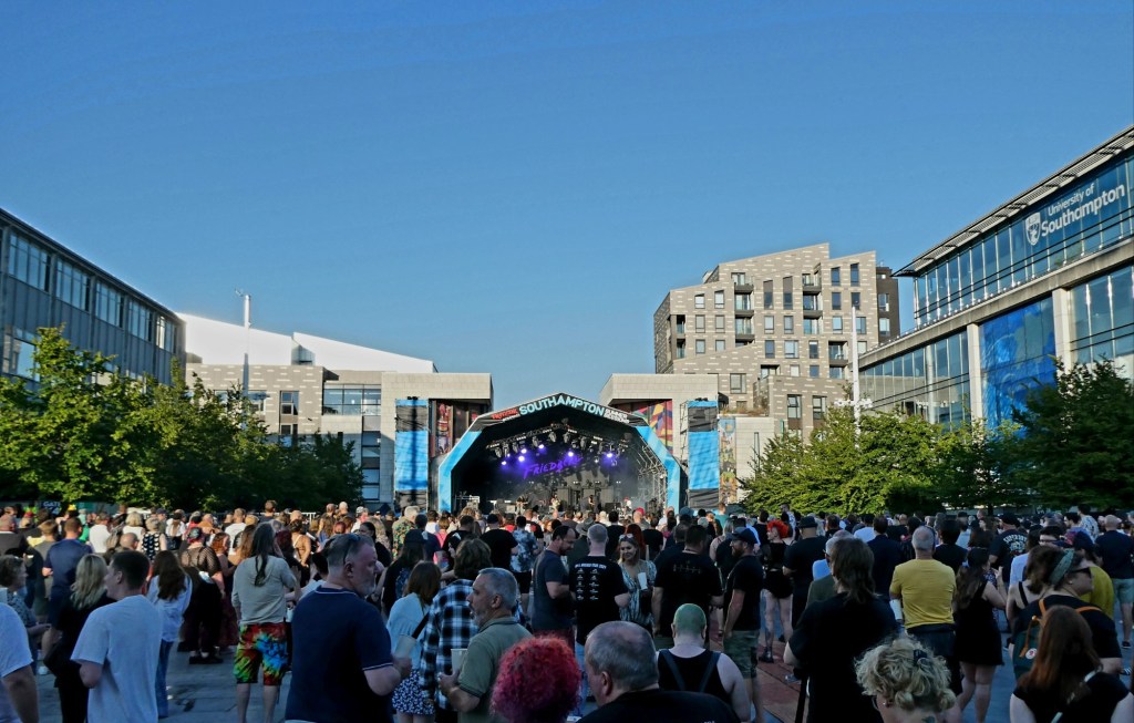 One of a series of outdoor concerts in various cities this summer, the Summer Sessions in Southampton is being held in the Guildhall Square. The Guildhall sits at one end of the square and the inside is used for four bars, a merch stand and has the usual toilets open – preferable to a smelly, hot plastic cubicle, although these are available outside in the square if anyone wants more of a festival experience.
