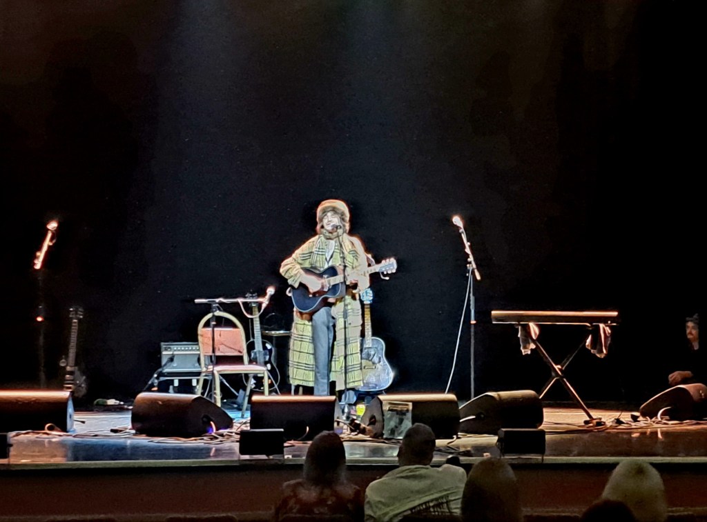He is accompanied on electric guitar on some tunes and his wife, Katria de Vidas, on keyboards for a bit while they both took some very arm’s length responsibility for their roaming young daughter. At some point she was just laying on the stage playing with their huge dog Gladys, and with some ear defenders on, until she got fed up with those. What a rock’n’roll daughter eh, and dog for that matter. (Last time I saw a dog on this stage was with Julian Clary.)