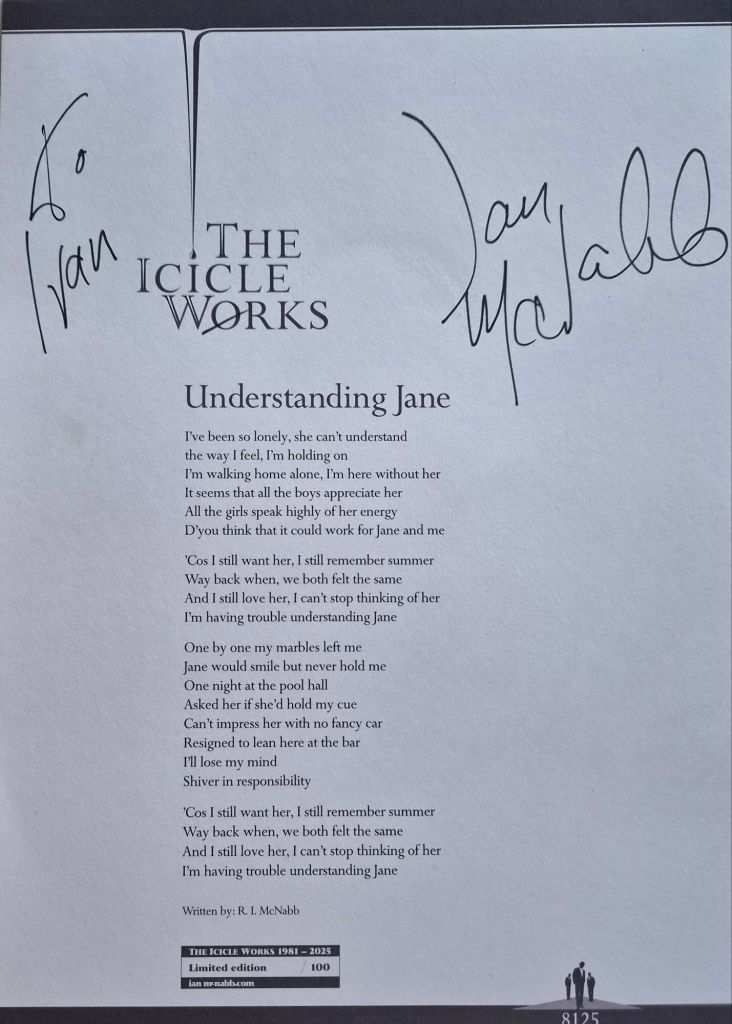 The set was of course, laced together with old Icicle Works songs. The brilliant rendition of Out of Season was memorable. Hollow Horse a necessity I guess and the anthem that is Understanding Jane, a single I still have, is a special one – nothing to do with my first wife…honest. Evangeline, another but never related.