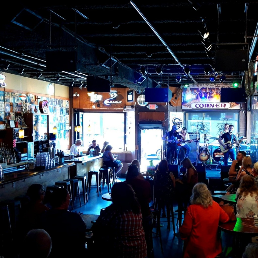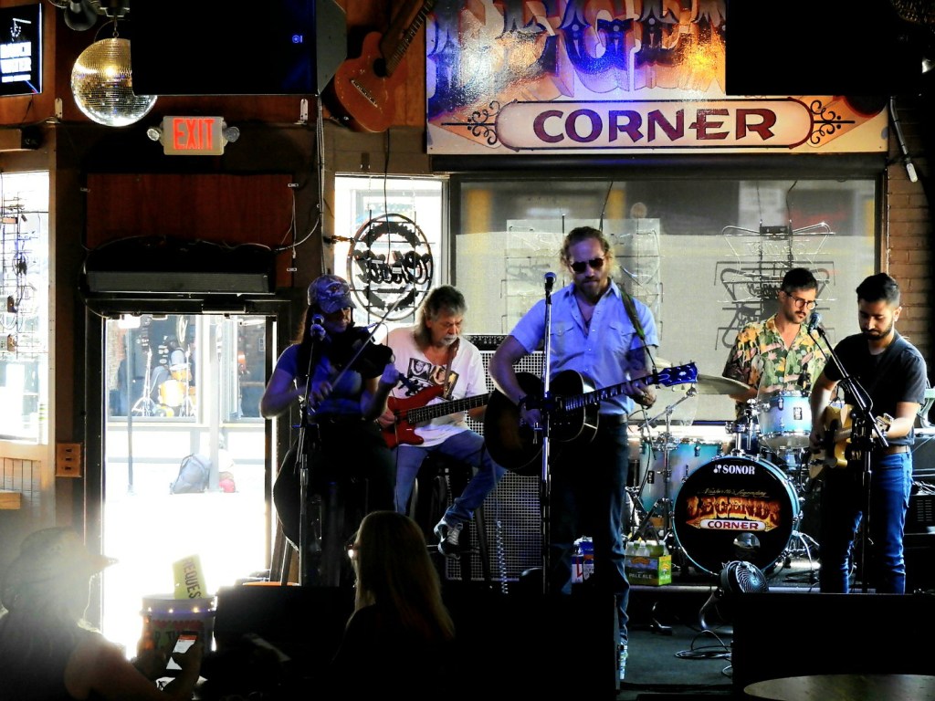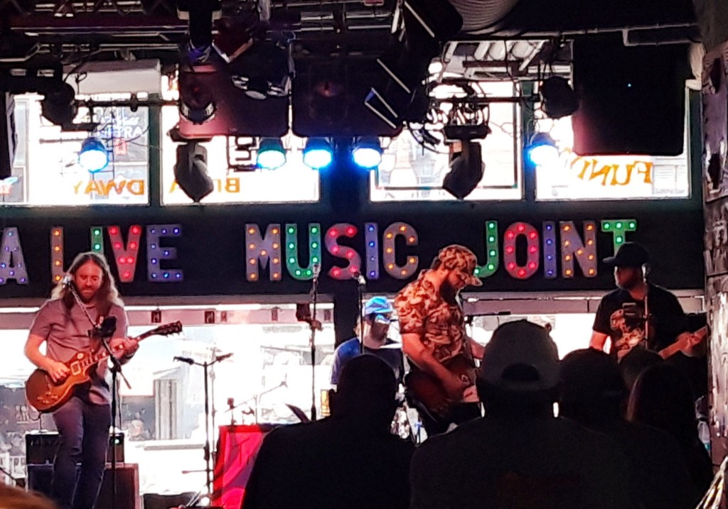 The Tin Roof is over the lights on the same side, Lower Broadway. Good food and beer. The band in here was very rocky and included an American Idol nearly man.